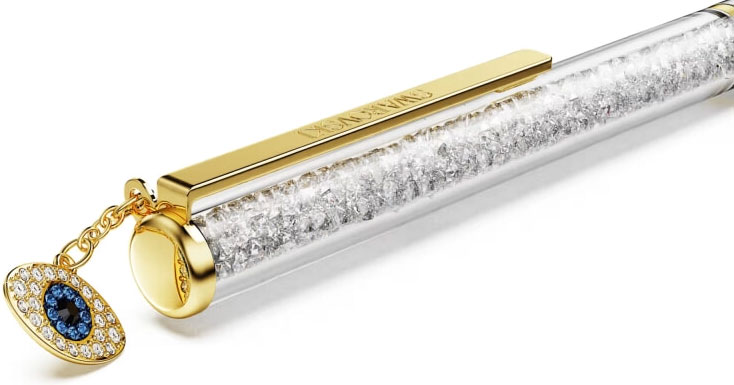 Корпус с хромированной отделкой и PVD покрытием цвета желтого золота. На конце ручки подвеска-амулет в виде глаза, украшенная кристаллами Swarovski.