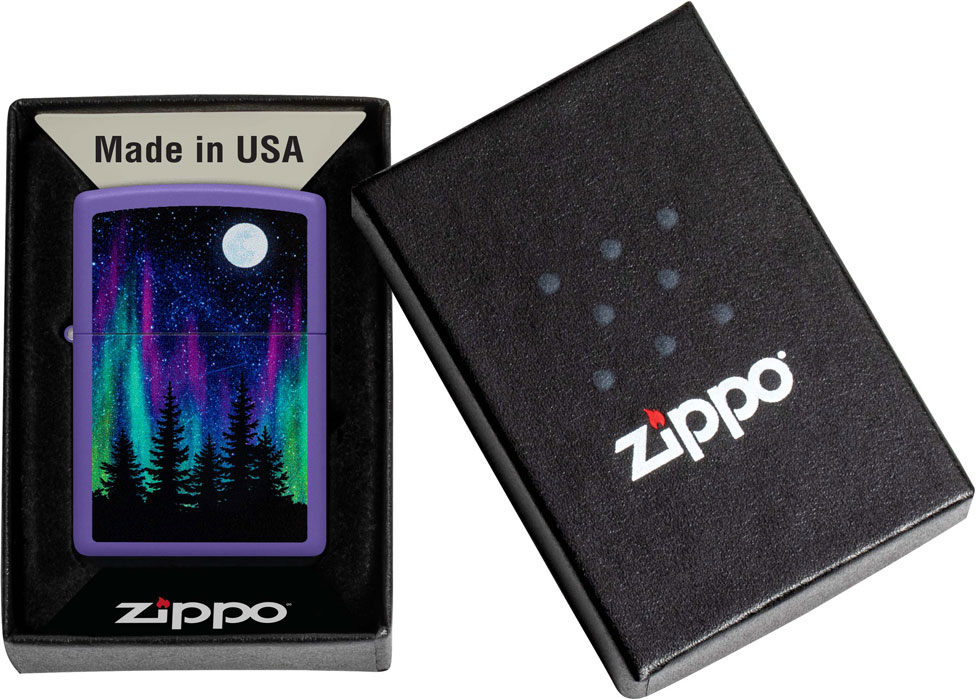 Металлический корпус с покрытием Purple Matte. Надежная ветроустойчивая конструкция для многоразового использования. Характерный для Zippo «щелчок» при открытии и закрытии.