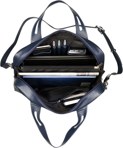 Сумка для документов на молнии. Внутри: 2 основных отделения, 3 держателя для пишущих инструментов, 2 открытых кармана и 2 отделения на молнии. Снаружи на задней стенке дополнительный карман. Возможность разместить ноутбук до 14 дюймов. Съемный регулируемый плечевой ремень.