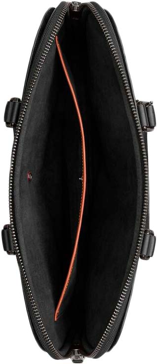 Портфель имеет две фиксированные ручки, дополненные кожаной подвеской с логотипом бренда, и регулируемый съемный ремень через плечо.