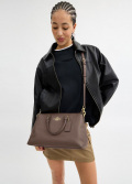 Сумка имеет две фиксированные ручки, дополненные кожаной подвеской с логотипом бренда, и регулируемый съемный ремень через плечо.
