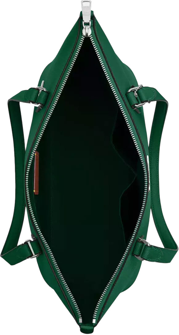 Сумка имеет две длинные ручки, дополненные кожаной подвеской с логотипом бренда.