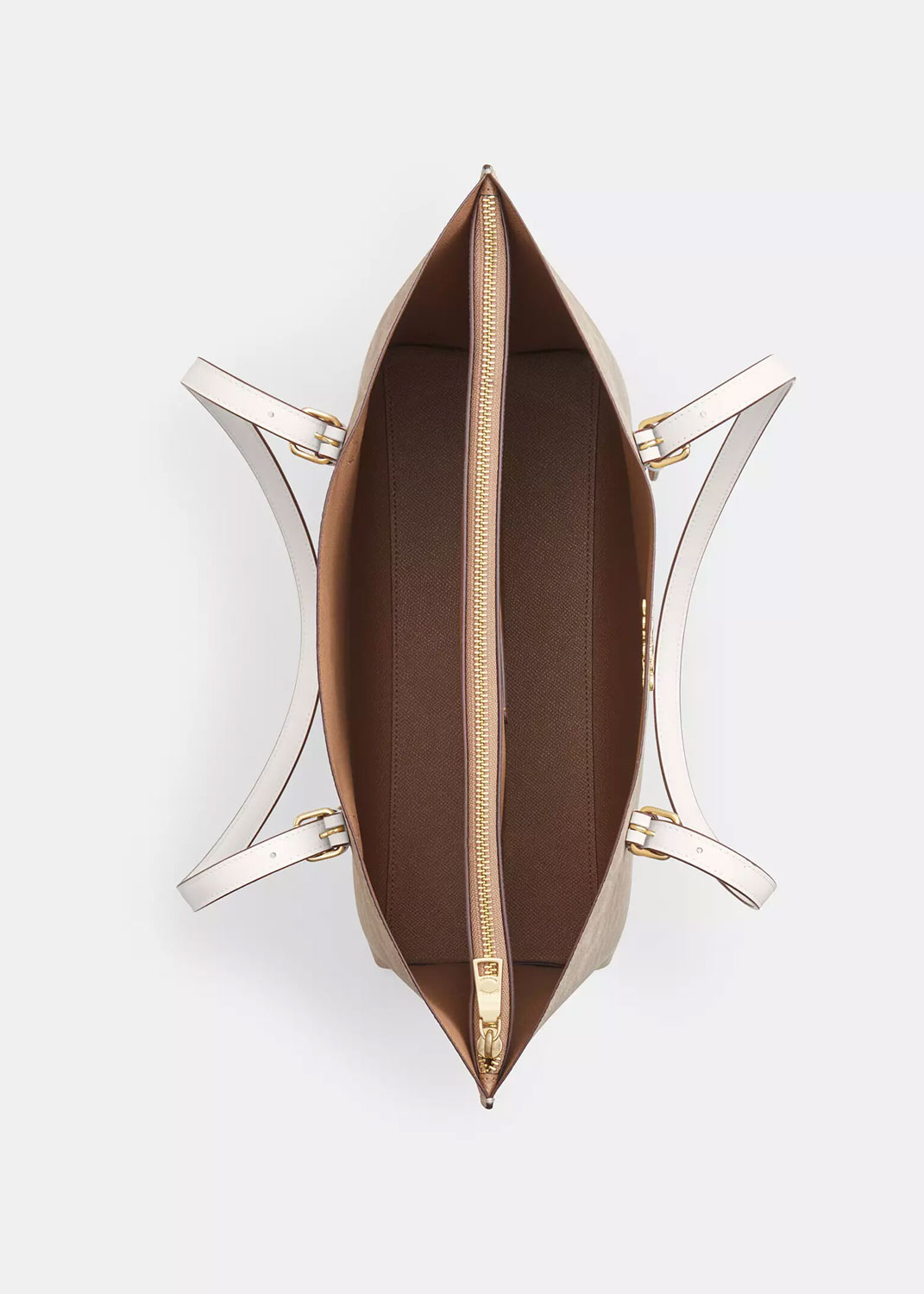 Сумка имеет две длинные ручки, дополненные кожаной подвеской с логотипом бренда.