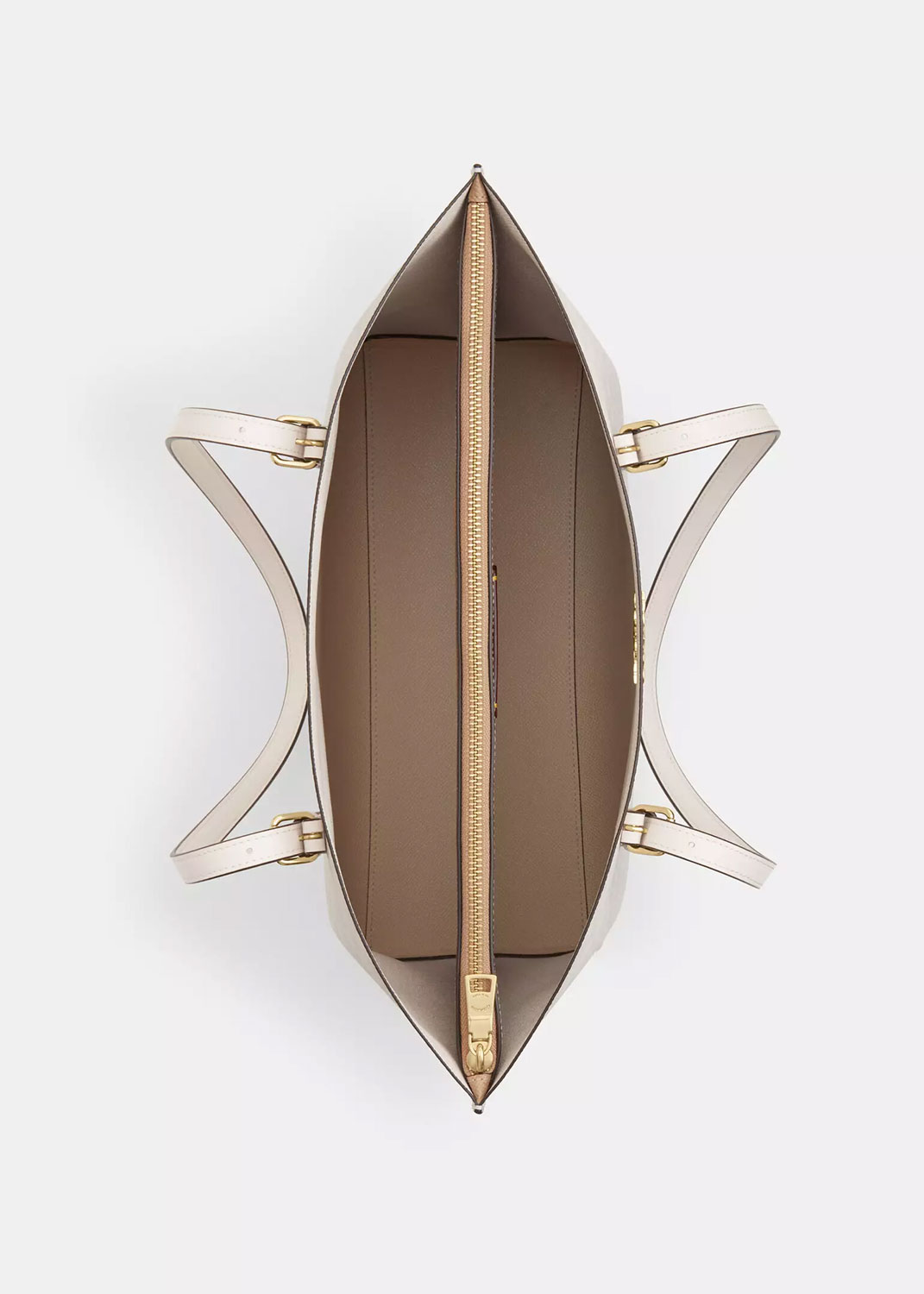Сумка имеет две длинные ручки, дополненные кожаной подвеской с логотипом бренда.