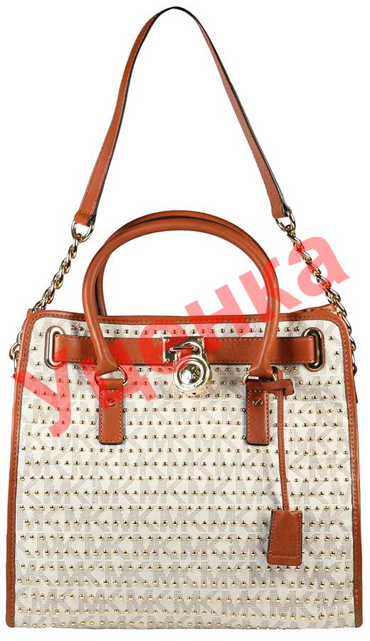 Женская сумка Hamilton Studded. Изготовлена из прочного холста с покрытием, украшена заклепками и логотипом бренда МК. Две удобные ручки. Закрывается на кнопку. Внутри: вместительное основное отделение, накладные карманы. В комплекте плечевой ремешок.