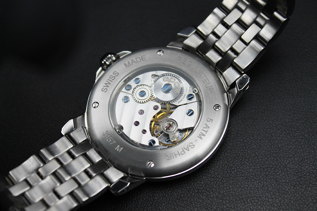 Белый циферблат с чёрными метками и голубыми стрелками непрост, ведь Epos Emotion не просто часы, а часы с усложнением. Именно так, Epos Emotion являются часами-регулятором, в них часовая, минутная, секундная стрелки выполняют свои задачи на совершенно разных, отдельных циферблатах.