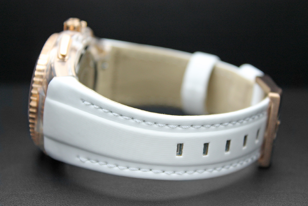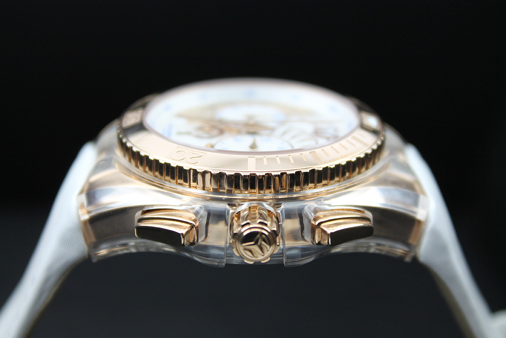 Белый цвет задаёт особое настроение в этих женских часах. Он повсюду – тканевый ремешок с кожаной подкладкой выполнен в белом цвете, ему вторит циферблат. Модуль покрытия цвета «розовое золото», окружающий циферблат, может быть сменён на силиконовый белый, благо такой модуль поставляется в комплекте. Ремешок так же может быть заменён на силиконовый, неизменно белый. Смена модулей мгновенно меняет облик часов – теперь это часы для занятий спортом, или плавания. Оно, в свою очередь, может происходить на внушительной глубине, ведь уровень водозащиты до двухсот (200) метров.