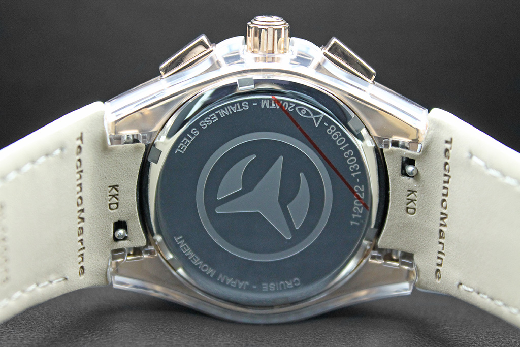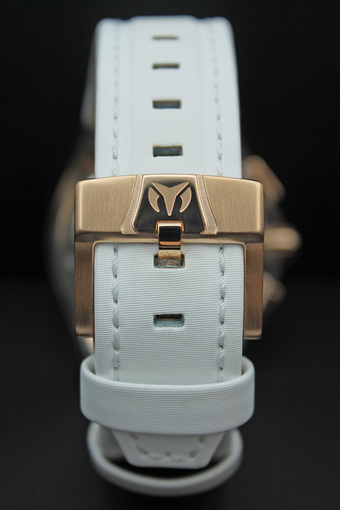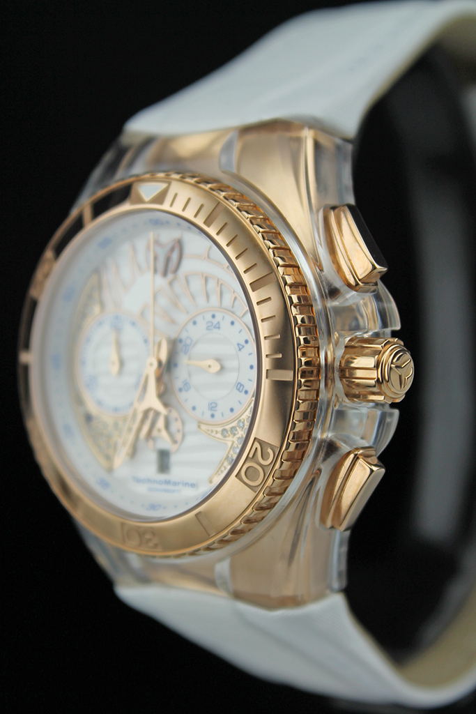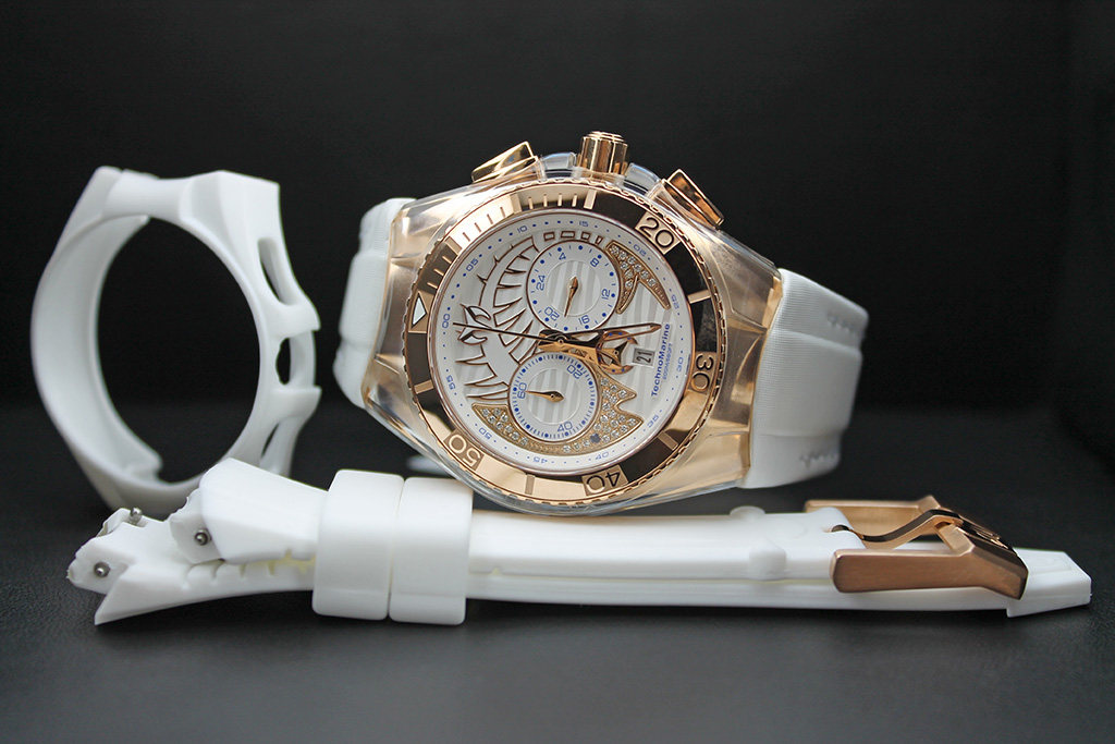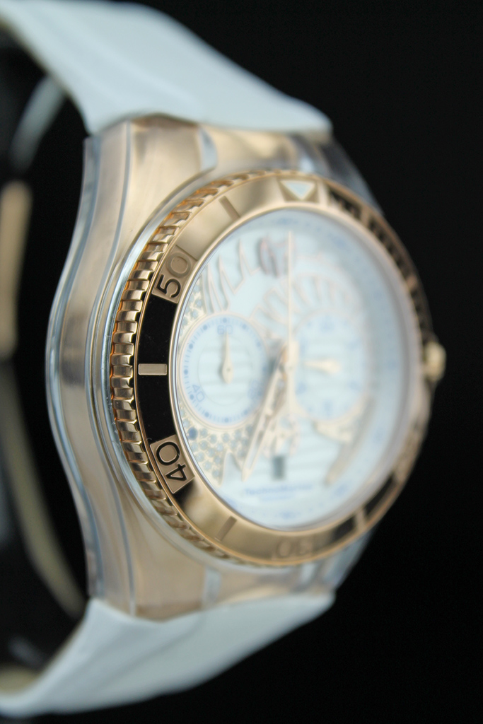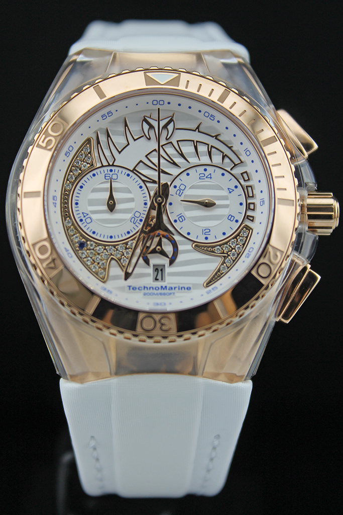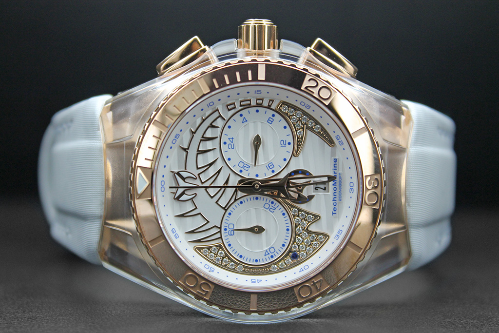 Но стоит вернуть модуль покрытия цвета «розовое золото» и тканевый ремешок, как часы вновь начинают создавать настроение знойной летней ночи, полной веселья и радости. Дирижёром такого настроения становится циферблат – он украшен 37 бриллиантами (0,1323К) и сапфиром (0,008К). Верхняя часть циферблата интересна узором в виде рыбы, сверху нанесён логотип компании TechnoMarine.