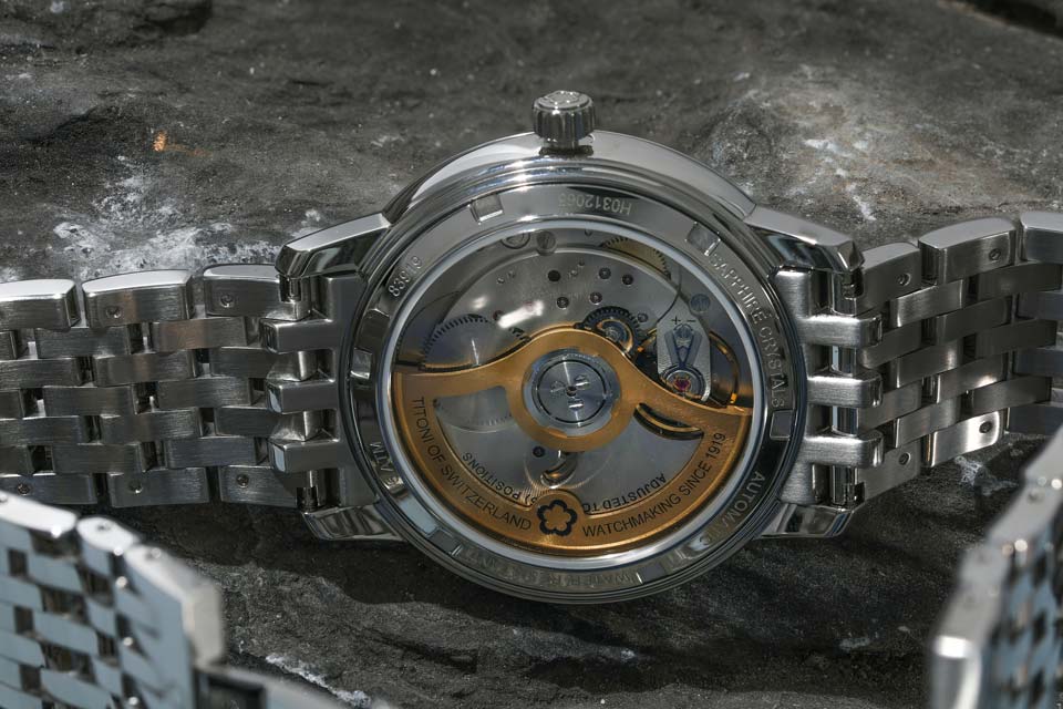 Что касается функционала, перед нами самое востребованное — три центральные стрелки и дата. Калибр же — первый у Titoni «домашний»: Т10. Декорирован он достаточно скромно, при крайне аккуратном исполнении. Обращает на себя внимание позолоченный ротор автоподзавода с ясно нанесенной маркировкой. Ну и приятны взгляду семь камней в платине...