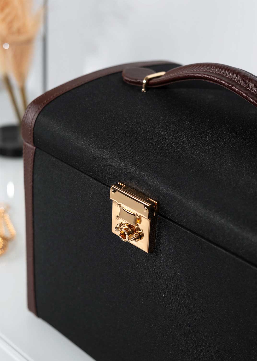 Раскрывающиеся боковые стенки закреплены на кнопки, на них располагаются крючки для подвесок и цепочек, а также дополнительные карманы для украшений. На крышке с внутренней стороны предусмотрено большое зеркало и ювелирный карман на резинке. Закрывается на ключ.