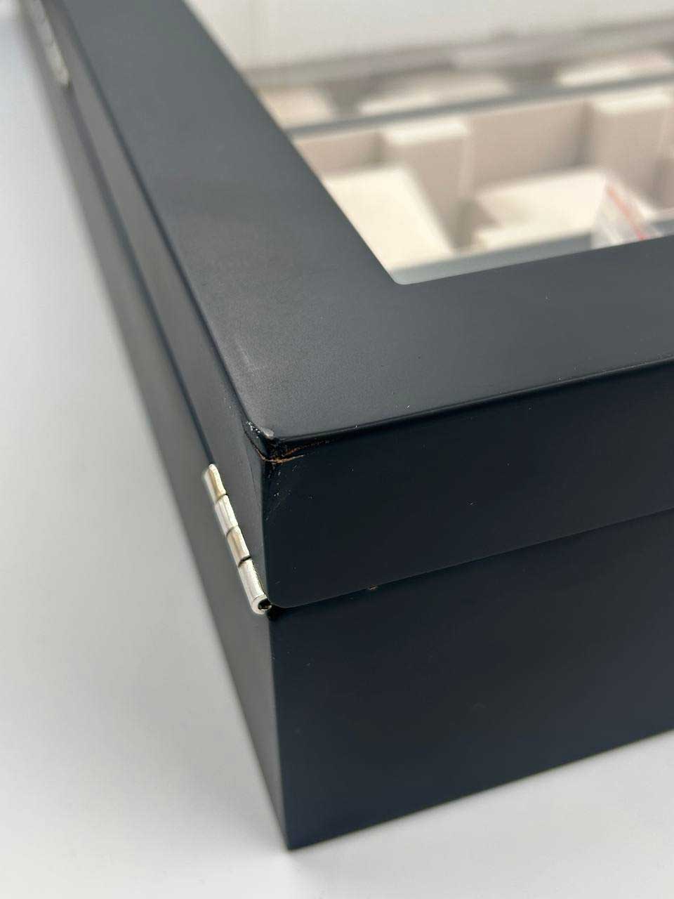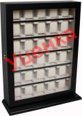 Коробка для 30 часов со стеклянной крышкой. Размер подушки для часов: обхват - 19см, ширина - 4,5см. Закрывается на ключ. Предусмотрена возможность крепления шкатулки на стену. В комплекте панель для установки шкатулки на горизонтальную поверхность.