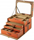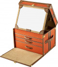 Внутри: 3 выдвижных отсека, отделения для украшений и валики для колец. На верхней крышке зеркало. Дорожный этуи с валиками для колец и 2 отделениями для украшений.