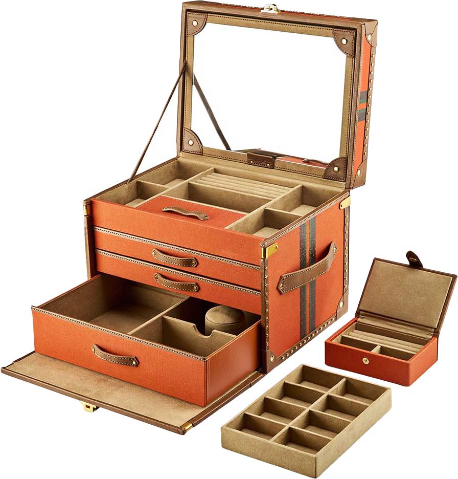 Внутри: 3 выдвижных отсека, отделения для украшений и валики для колец. На верхней крышке зеркало. Дорожный этуи с валиками для колец и 2 отделениями для украшений.