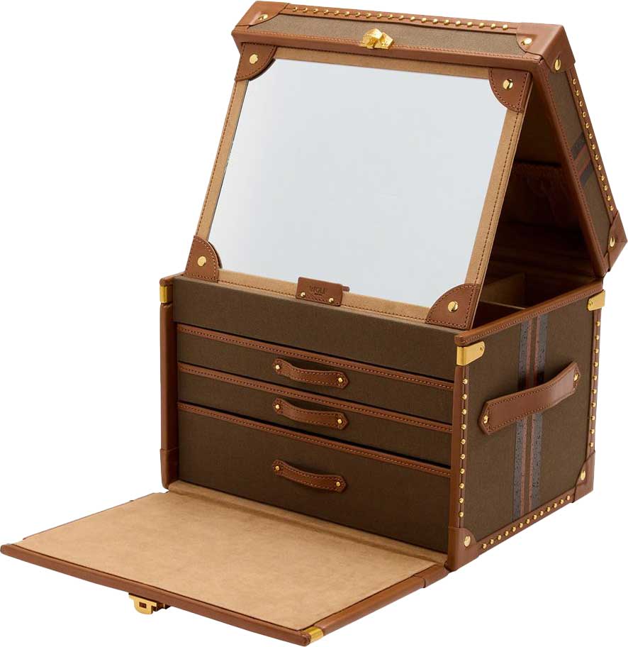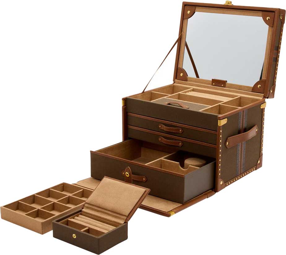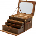 Внутри: 3 выдвижных отсека, отделения для украшений и валики для колец. На верхней крышке зеркало. Дорожный этуи с валиками для колец и 2 отделениями для украшений.