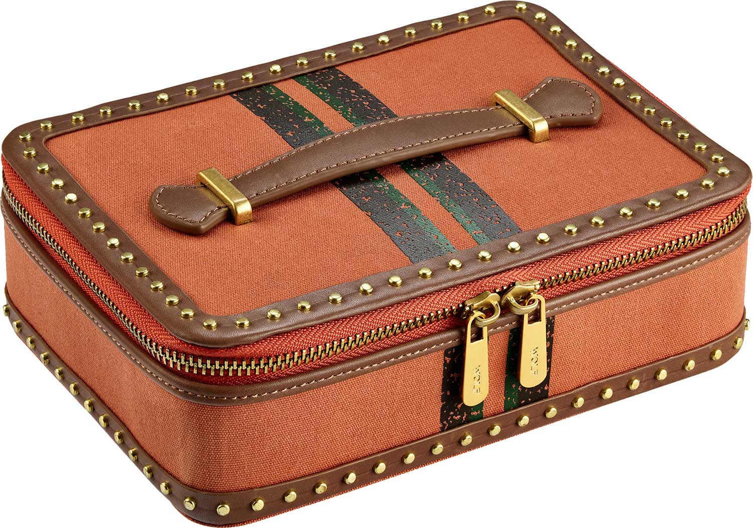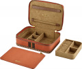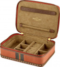Внутри мешочек на молнии и 2 вынимающихся отсека, в которых находятся 6 отделений для украшений и валики для колец. На крышке находится валик для колец и держатель для серьг.