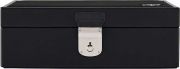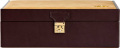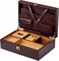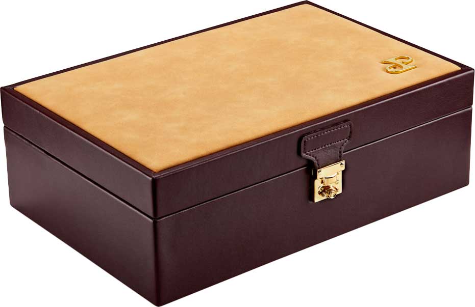 На крышке находится органайзер для канцелярских принадлежностей, 3 файла для документов, карман на кнопке и отделение для хранения кредитных карт. Внутреннее покрытие из искусственной замши с технологией LusterLoc, которое предотвращает потускнение ювелирных изделий. Закрывается ключом на замок, который разработан по индивидуальному заказу. Крышка украшена уникальным логотипом в честь 190-летия компании «Wolf».