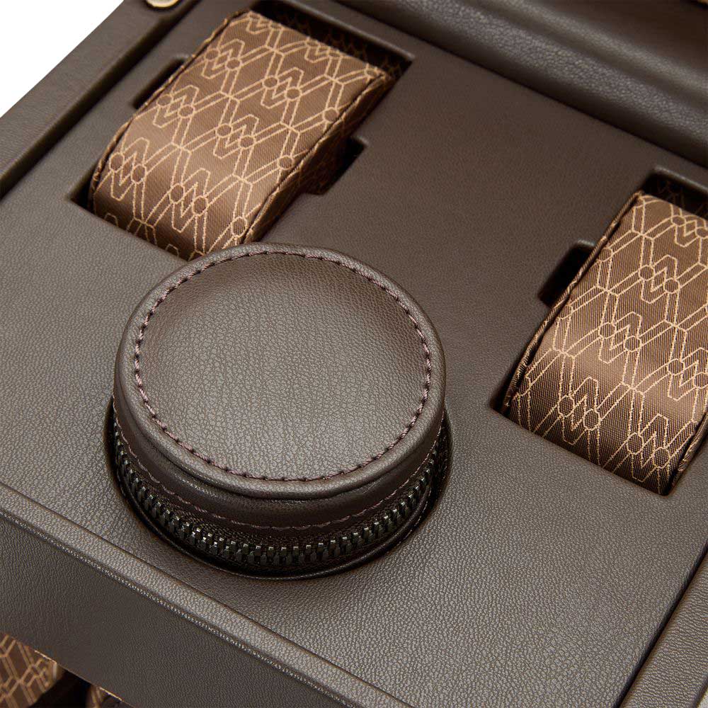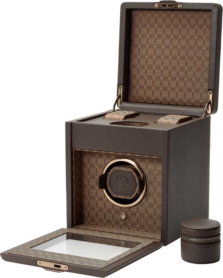 В верхней части шкатулки находится отделение с 2-мя подушечками для часов и дополнительным съемным отделением на молнии. Внутренняя отделка - переработанный жаккардовый шелк с фирменным узором «Wolf». Питание от сети. Закрывается на ключ.