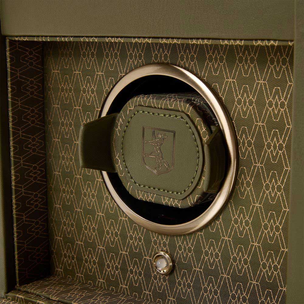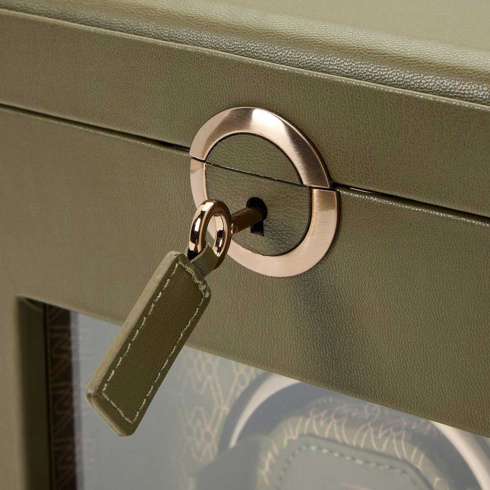 В верхней части шкатулки находится отделение с 2-мя подушечками для часов и дополнительным съемным отделением на молнии. Внутренняя отделка - переработанный жаккардовый шелк с фирменным узором «Wolf». Питание от сети. Закрывается на ключ.
