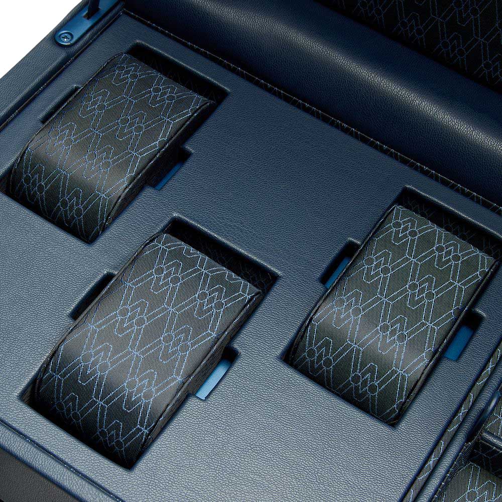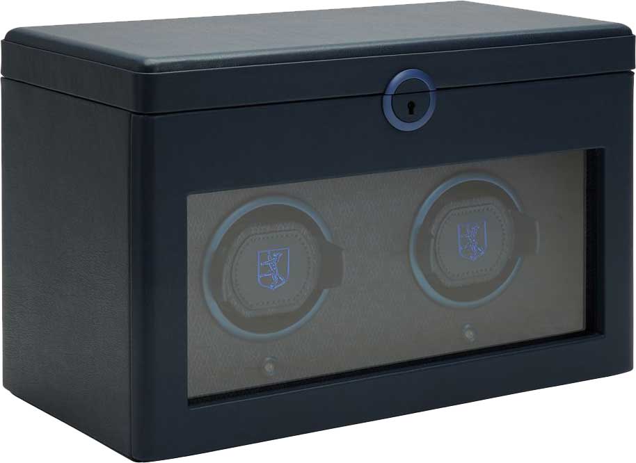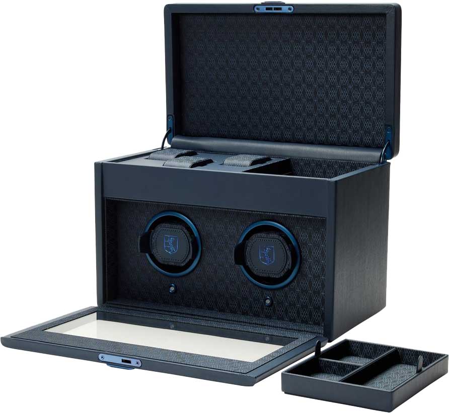 В верхней части шкатулки находится отделение с 3-мя подушечками для часов и вынимающийся лоток с отсеками для аксессуаров. Внутренняя отделка - переработанный жаккардовый шелк с фирменным узором «Wolf». Питание от сети. Закрывается на ключ.