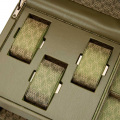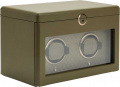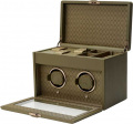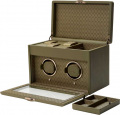 В верхней части шкатулки находится отделение с 3-мя подушечками для часов и вынимающийся лоток с отсеками для аксессуаров. Внутренняя отделка - переработанный жаккардовый шелк с фирменным узором «Wolf». Питание от сети. Закрывается на ключ.