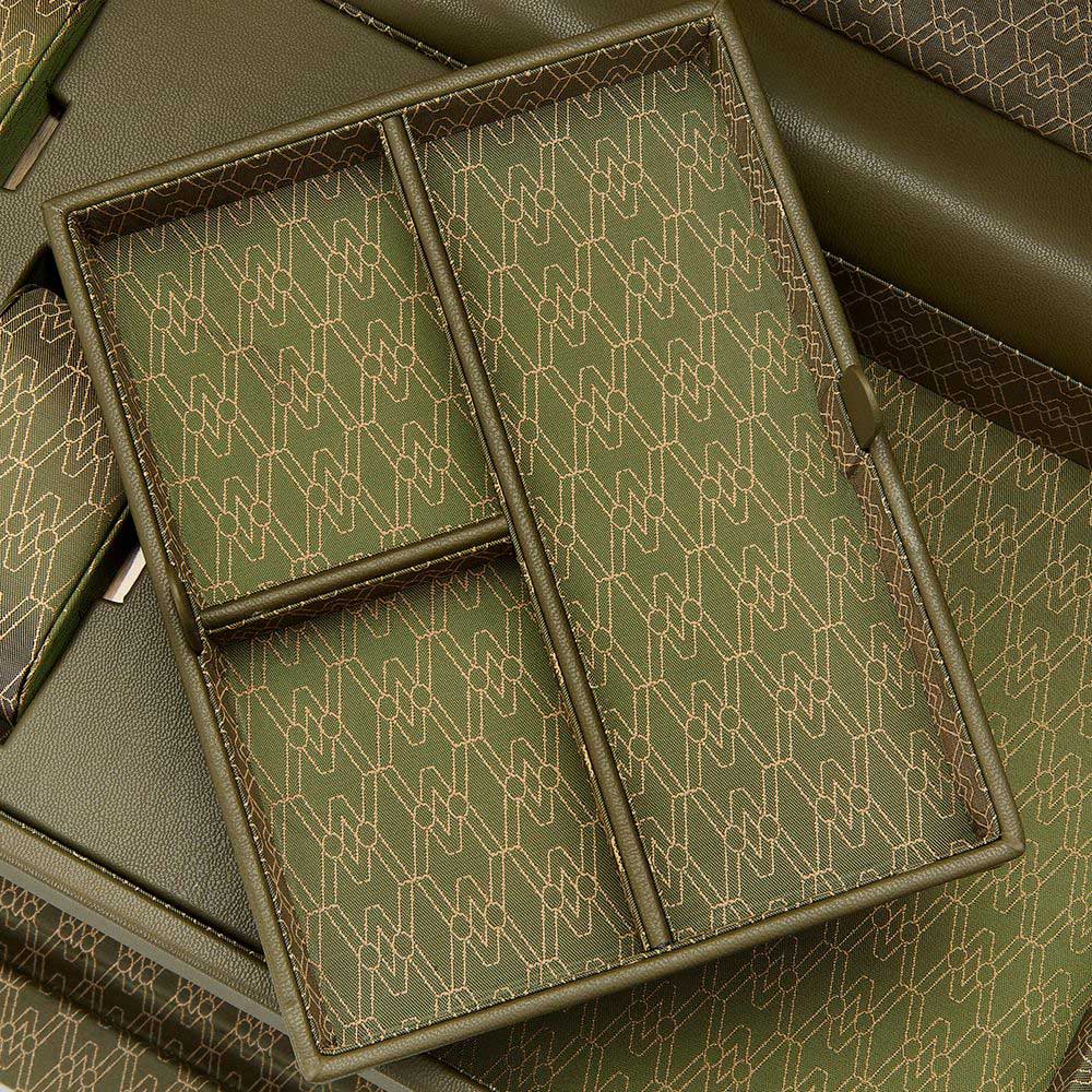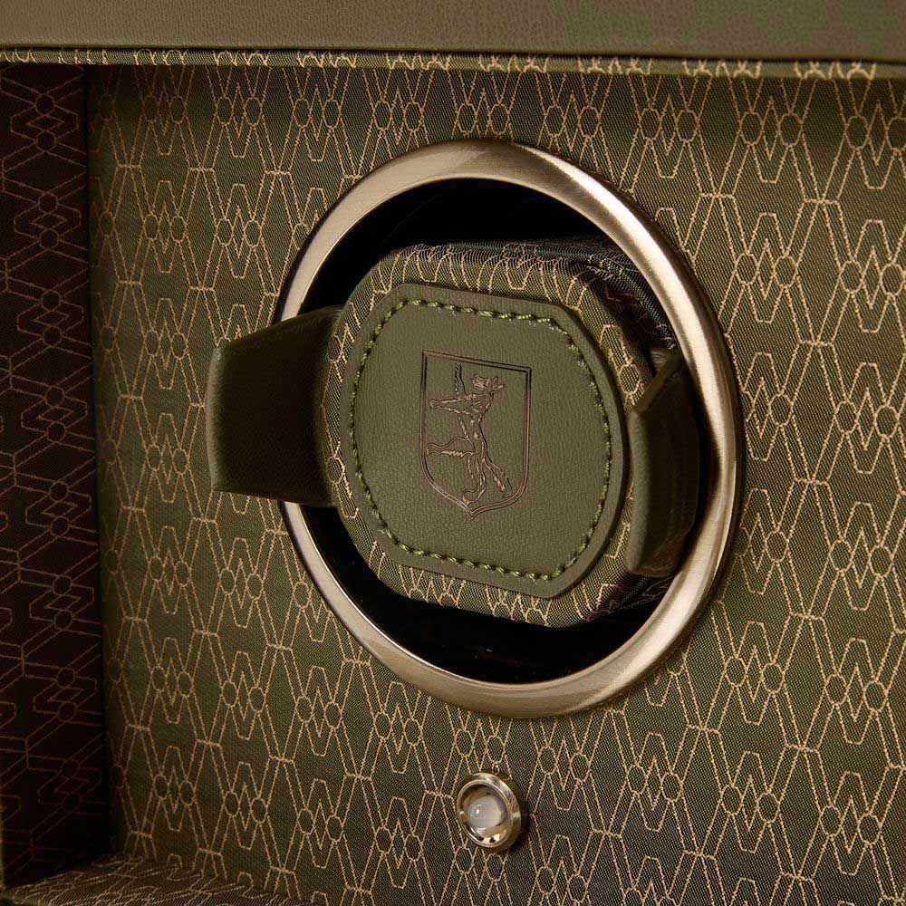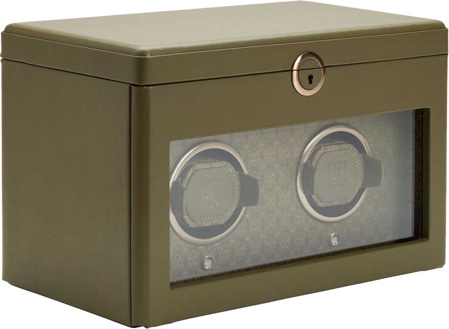 В верхней части шкатулки находится отделение с 3-мя подушечками для часов и вынимающийся лоток с отсеками для аксессуаров. Внутренняя отделка - переработанный жаккардовый шелк с фирменным узором «Wolf». Питание от сети. Закрывается на ключ.
