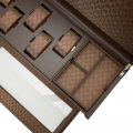 В верхней части шкатулки находится отделение с 5-ю подушечками для часов и вынимающийся лоток с отсеками для аксессуаров. Внутренняя отделка - переработанный жаккардовый шелк с фирменным узором «Wolf». Питание от сети. Закрывается на ключ.