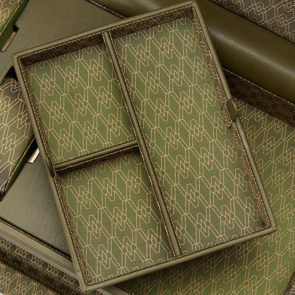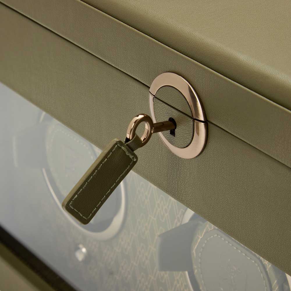 В верхней части шкатулки находится отделение с 5-ю подушечками для часов и вынимающийся лоток с отсеками для аксессуаров. Внутренняя отделка - переработанный жаккардовый шелк с фирменным узором «Wolf». Питание от сети. Закрывается на ключ.