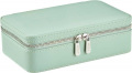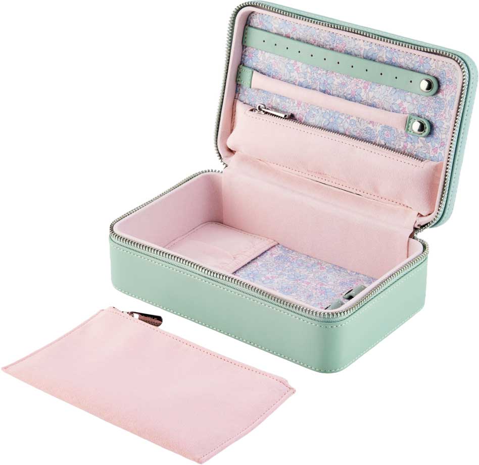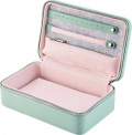 Внутри: отделение на молнии, держатель для сережек с отверстиями, длинный держатель для колец на кнопке, вынимаемый многоцелевой чехол с отделениями молнии, на дне 3 петли на кнопке для колье и кармашек на резинке.