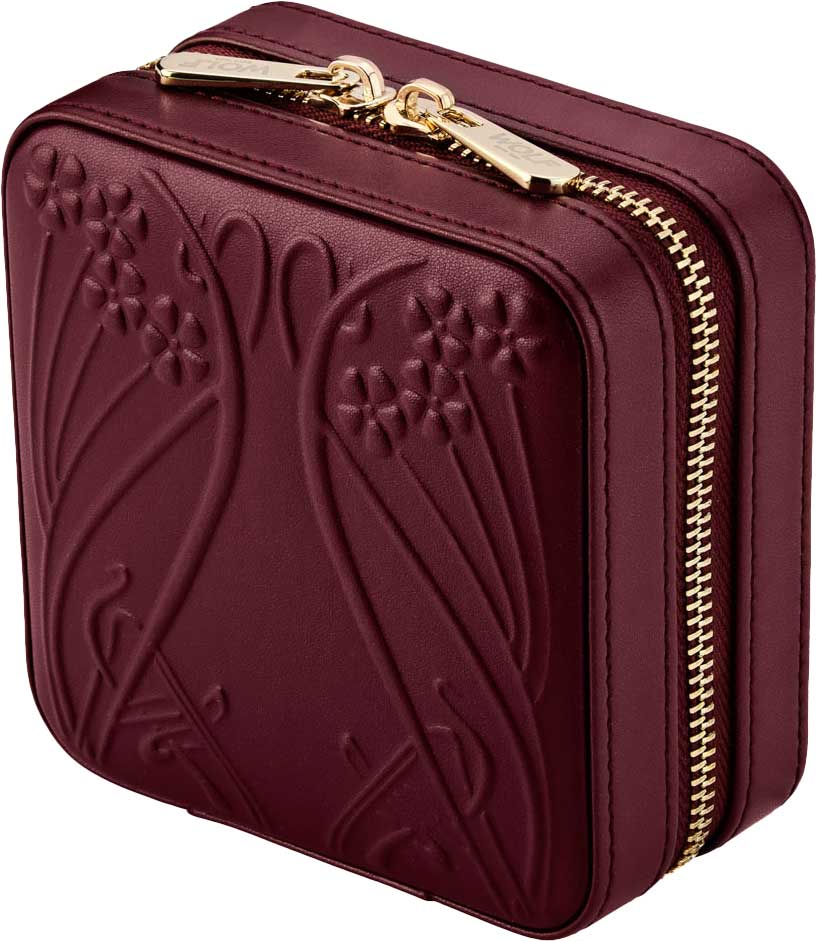 Внутри: 4 отсека для украшений и валики для колец. На верхней крышке зеркало, держатель для цепочек, открытый кармашек, валик для колец и держатель для серег. Внутреннее покрытие с технологией LusterLoc, которое предотвращает потускнение ювелирных изделий.