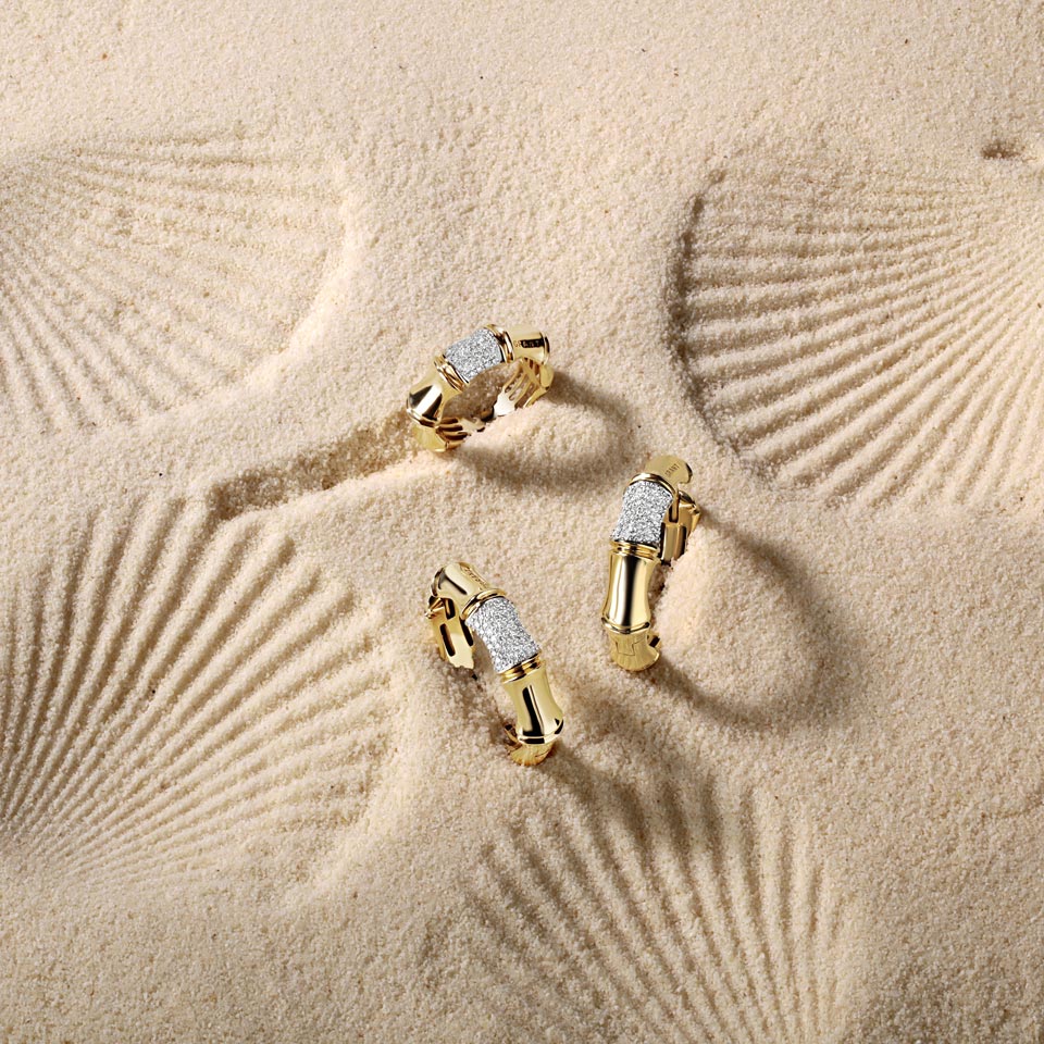 Золотое кольцо выполнено из десяти сегментов: двух коротких и восьми длинных. Такое дизайнерское решение придает изделию довольно нестандартную форму. Каждый из коротких сегментов декорирован двойным рядом бриллиантов.