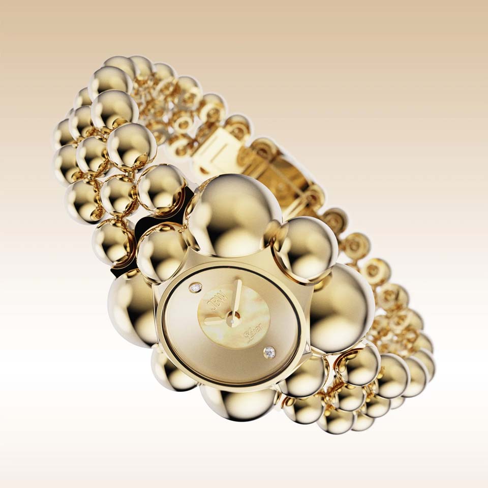 Часы коллаборация JBW и LUAR. Atmosphere воплощает время и пространство в сферическом ювелирном дизайне, отражающем свет под любым углом. Часы изготовлены из нержавеющей стали и покрыты 18-каратным золотом, имеют элегантный перламутровый циферблат и украшены двумя выращенными в лаборатории бриллиантами в положении «6 часов» и «12 часов». Изгиб 30-миллиметрового корпуса повторяется 16-миллиметровым браслетом, который плавно обхватывает запястье, создавая сияющую отделку.