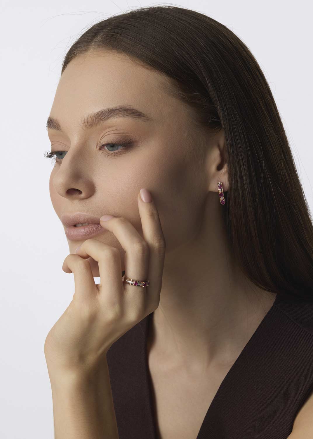 - рубин - 6шт. - 1,42К, чистота камня 2/2 (цвет, качество), бриллиант в 57 граней - 12шт. - 0,026К, чистота камня 4/5А (цвет, качество)