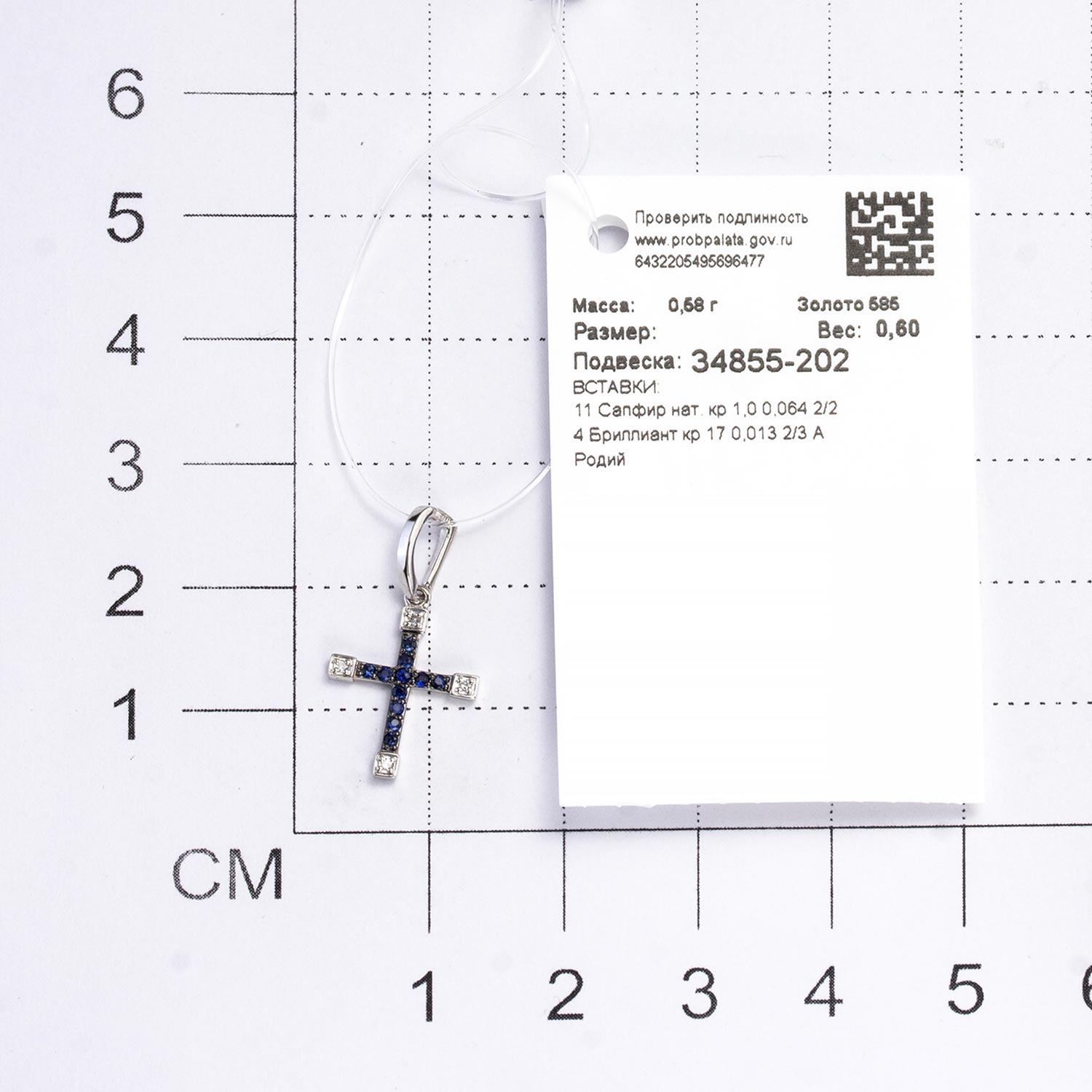 Фото «Женский декоративный крестик из белого золота Алькор 34855-202 с сапфирами, бриллиантами»