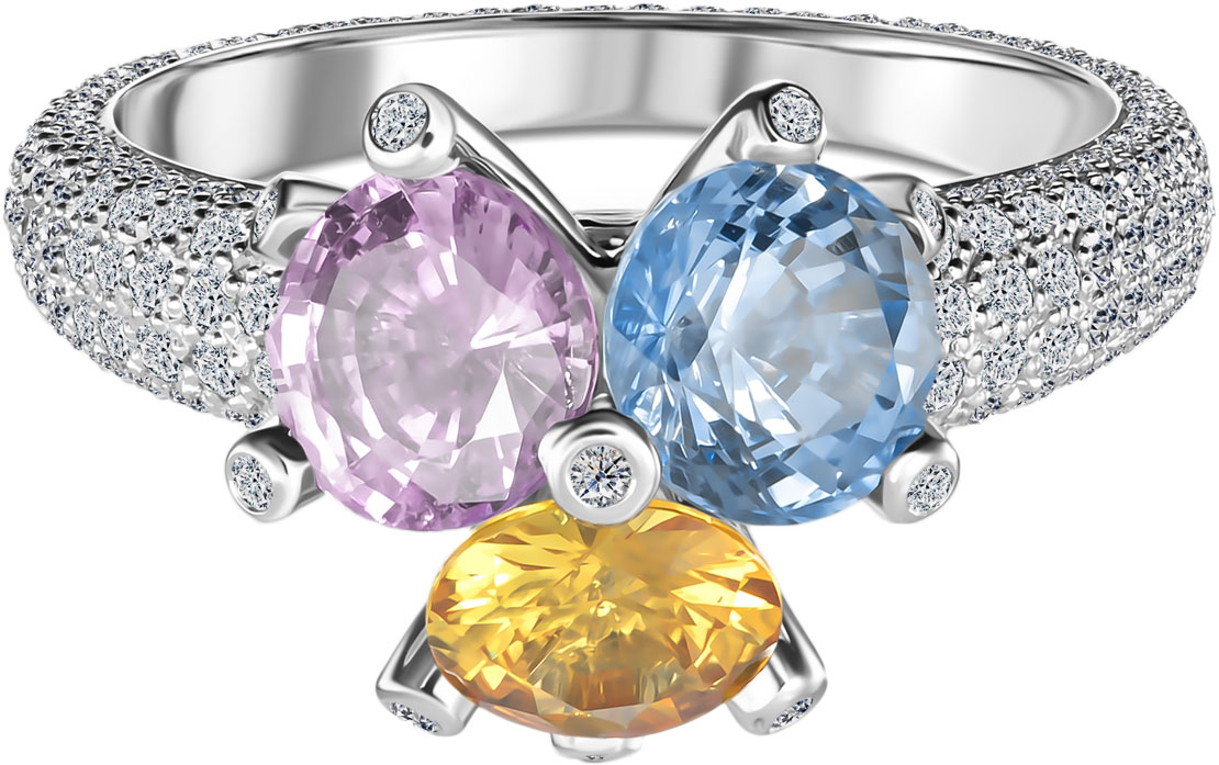 - розовый сапфир - 1,12К, чистота камня 2/2 (цвет, качество), синий сапфир - 1,55К, чистота камня 2/2 (цвет, качество), желтый сапфир - 0,97К, чистота камня 2/2 (цвет, качество), бриллиант в 57 граней - 28шт. - 0,21К, чистота камня 2/4 (цвет, качество), бриллиант в 57 граней - 252шт. - 0,92К, чистота камня 2/4 (цвет, качество)