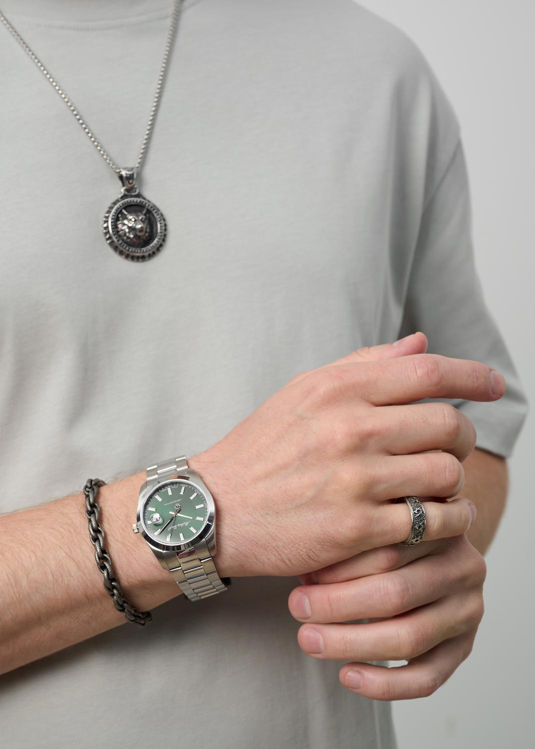 - кожа, сталь, тигровый глаз, вес: 20,75г.