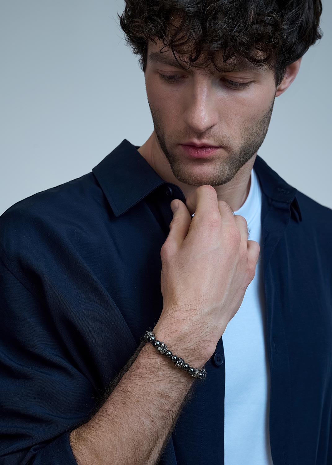 - текстильный шнурок (ткань), гематит, серебро, вес: 24,96г.