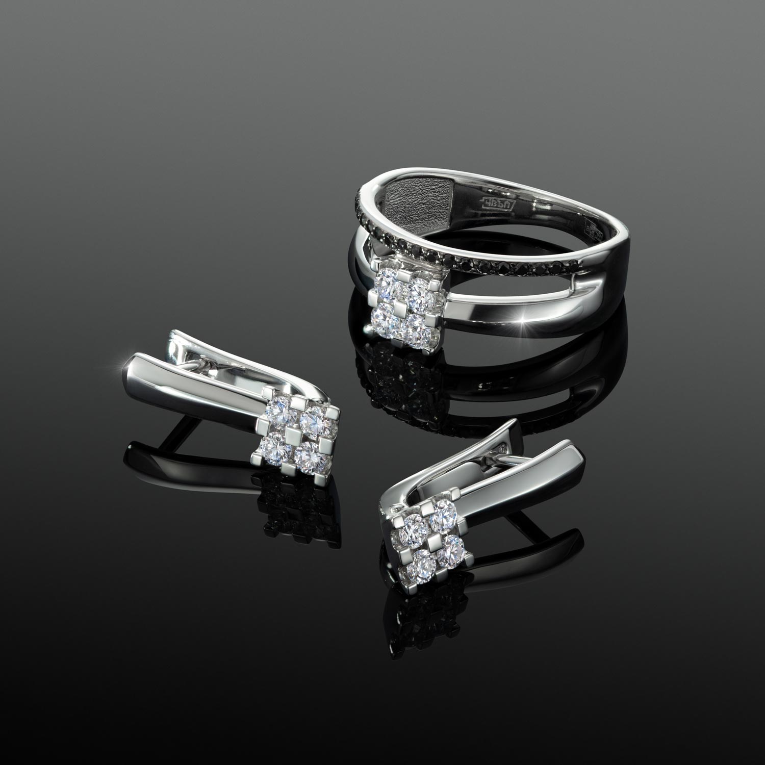 - бриллиант - 4шт. в 57 граней - 0,24К, чистота камня 3/5А (цвет, качество), бриллиант черный - 19шт. в 57 граней - 0,119К, чистота камня 7/6 (цвет, качество)