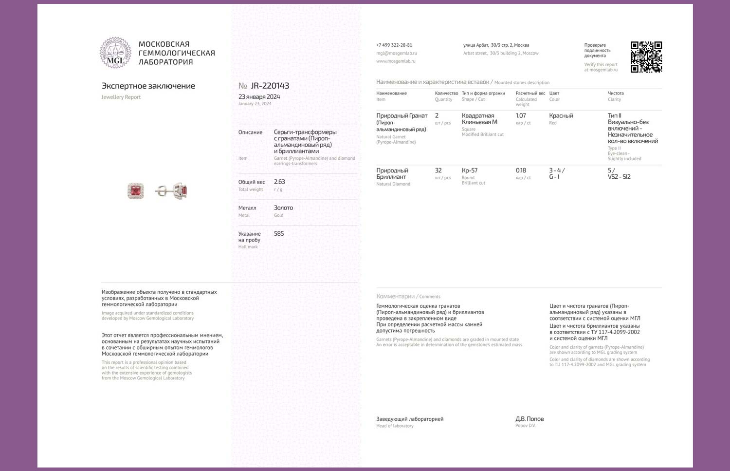 - гранат - 2шт. - 0,94К, бриллиант - 32шт. в 57 граней - 0,16К, чистота камня 3/6 (цвет, качество)