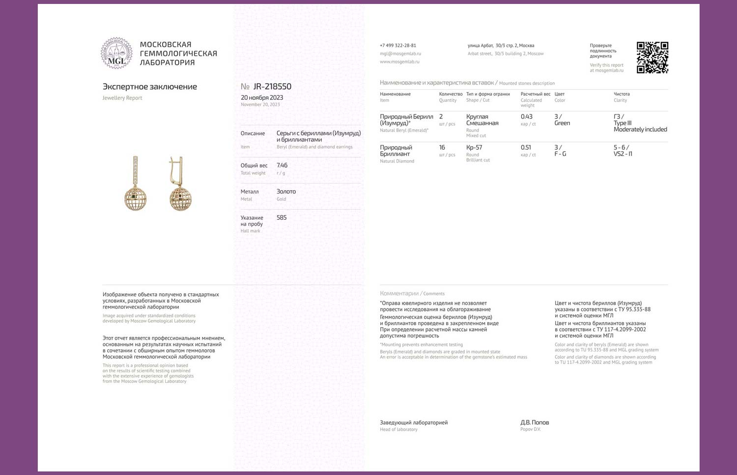 - изумруд - 2шт. - 0,43К, чистота камня 2/г3 (цвет, качество), бриллиант в 57 граней - 16шт. - 0,51К, чистота камня 3/6 (цвет, качество)