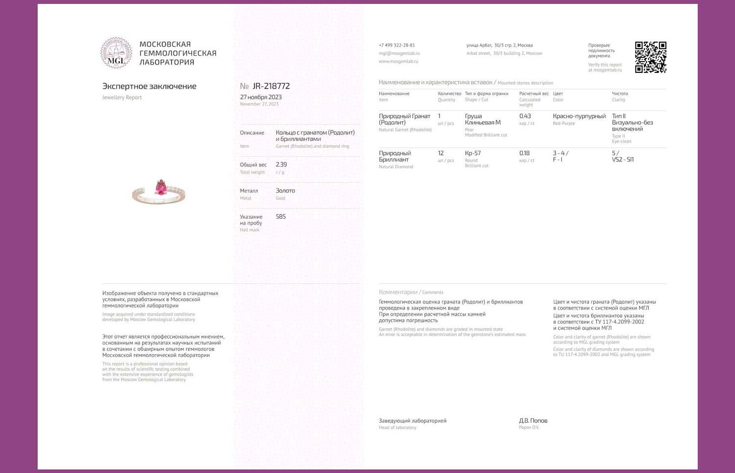 - родолит - 0,47К, бриллиант - 12шт. в 57 граней - 0,19К, чистота камня 3/5 (цвет, качество)