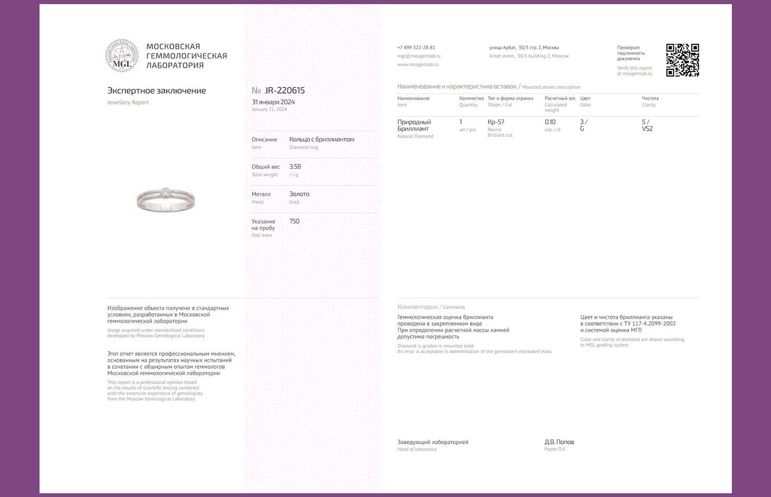 - бриллиант в 57 граней - 0,109К, чистота камня 3/5 (цвет, качество)
