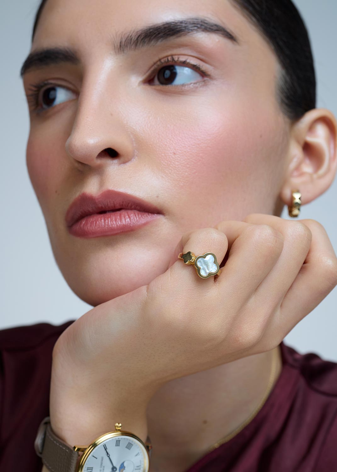 - желтое золото, перламутр, вес: для размера 17 - 1,91г.