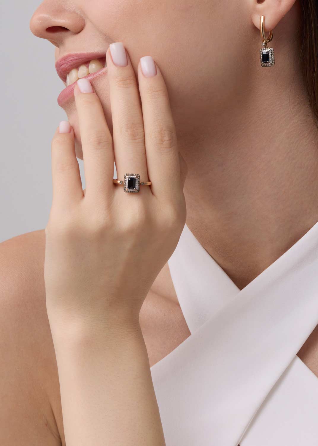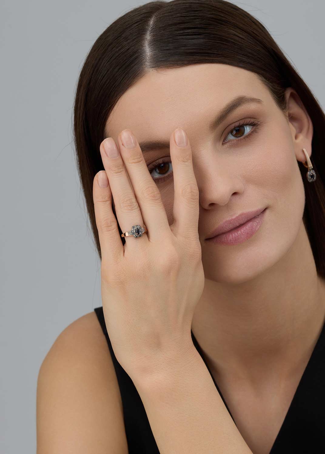 - красное золото, бриллиант, сапфир, коньячный бриллиант