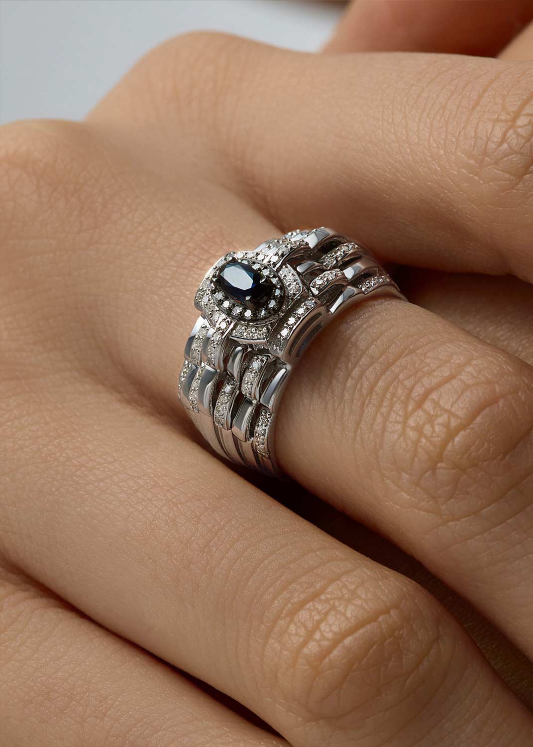 - белое золото, бриллиант, сапфир, вес: для размера 17 - 1,84г.