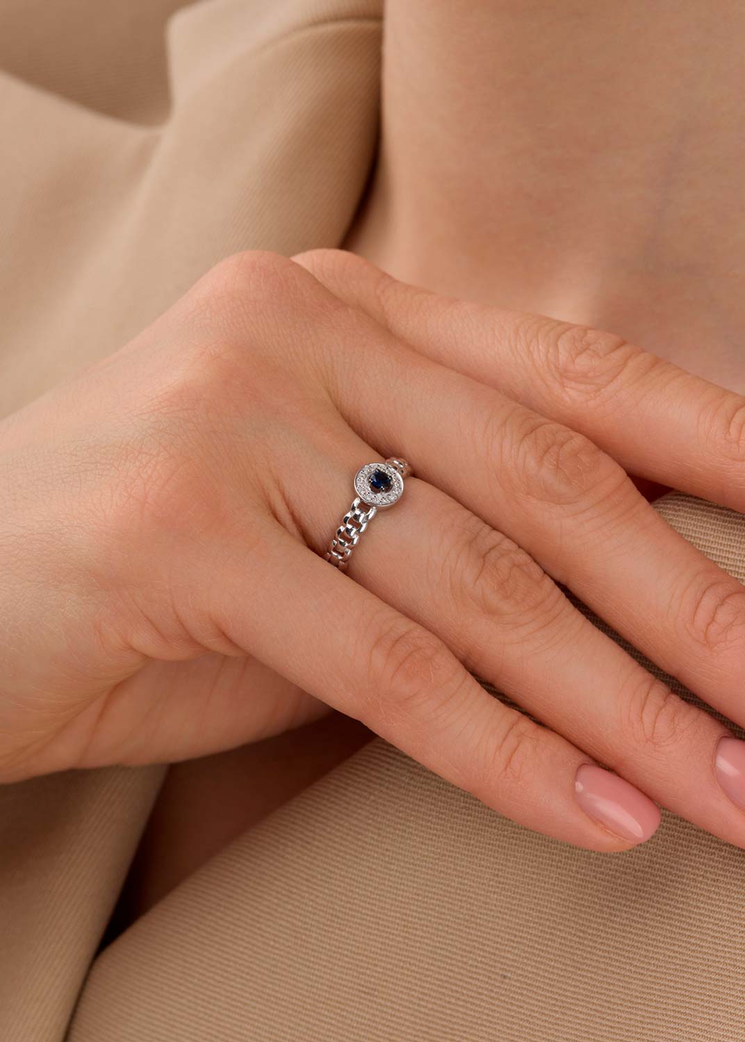 - белое золото, бриллиант, сапфир, вес: для размера 17,5 - 2,2г.