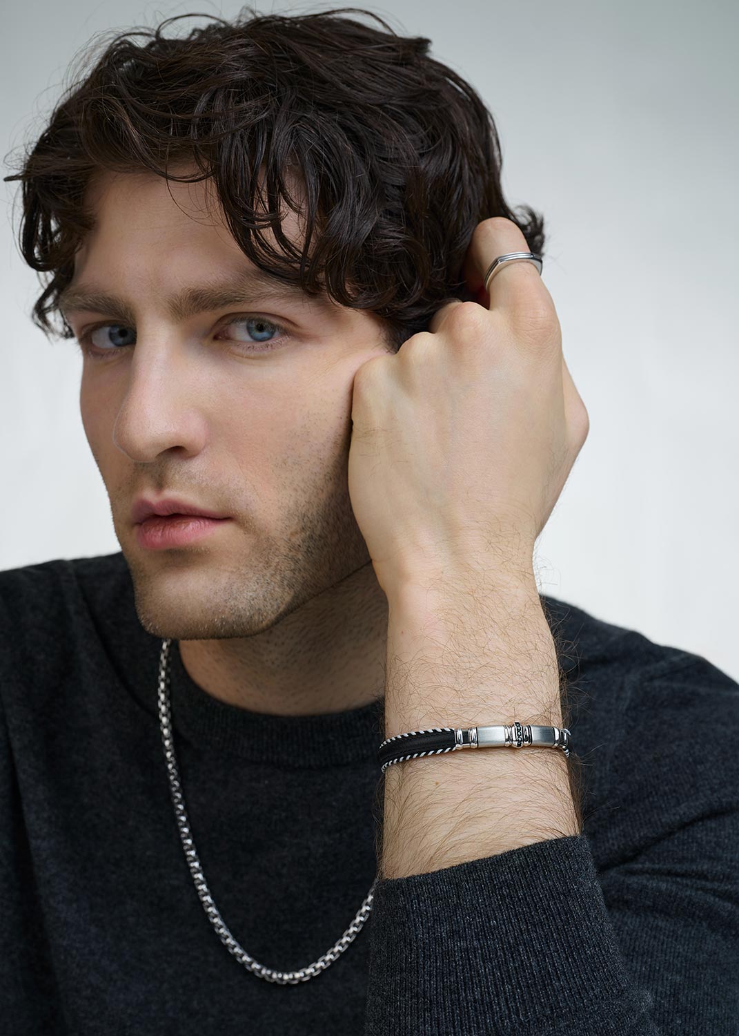 - кожа, серебро, сталь, серебро, сталь, шпинель, вес: 7,91г.