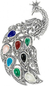 Серебряная брошь Марказит HB566-mix-mr с бирюзой, лазуритом, ониксом, перламутром, сердоликом, хризопразом, марказитами Swarovski