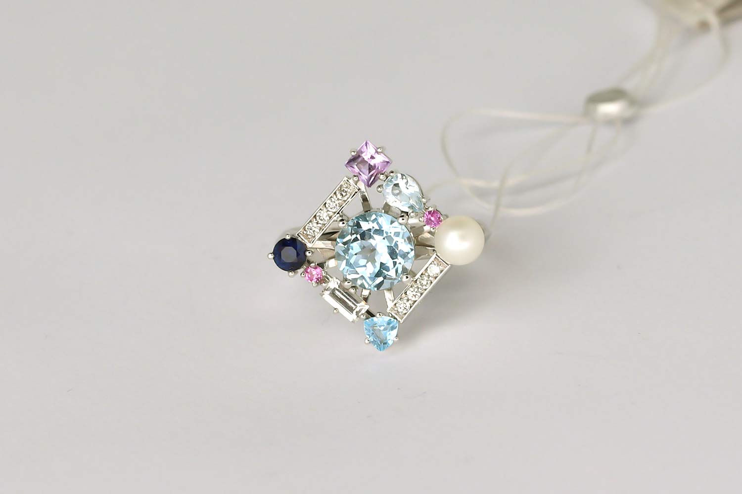 - бриллиант CVD – 10шт. – 0,080К, сапфир – 0,120К, сапфир – 2шт. – 0,030К, сапфир – 0,120К, топаз – 3шт., аметист, жемчуг