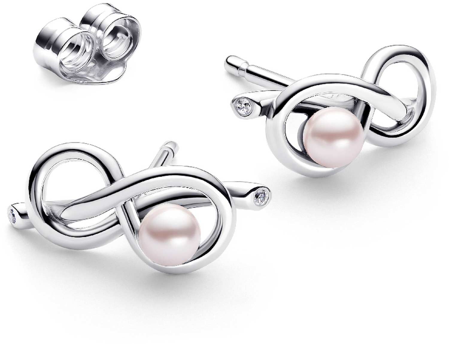 Серебряные серьги пусеты-гвоздики ''Узел бесконечности'' PANDORA Moments 293761C01 с искусственным жемчугом, фианитами