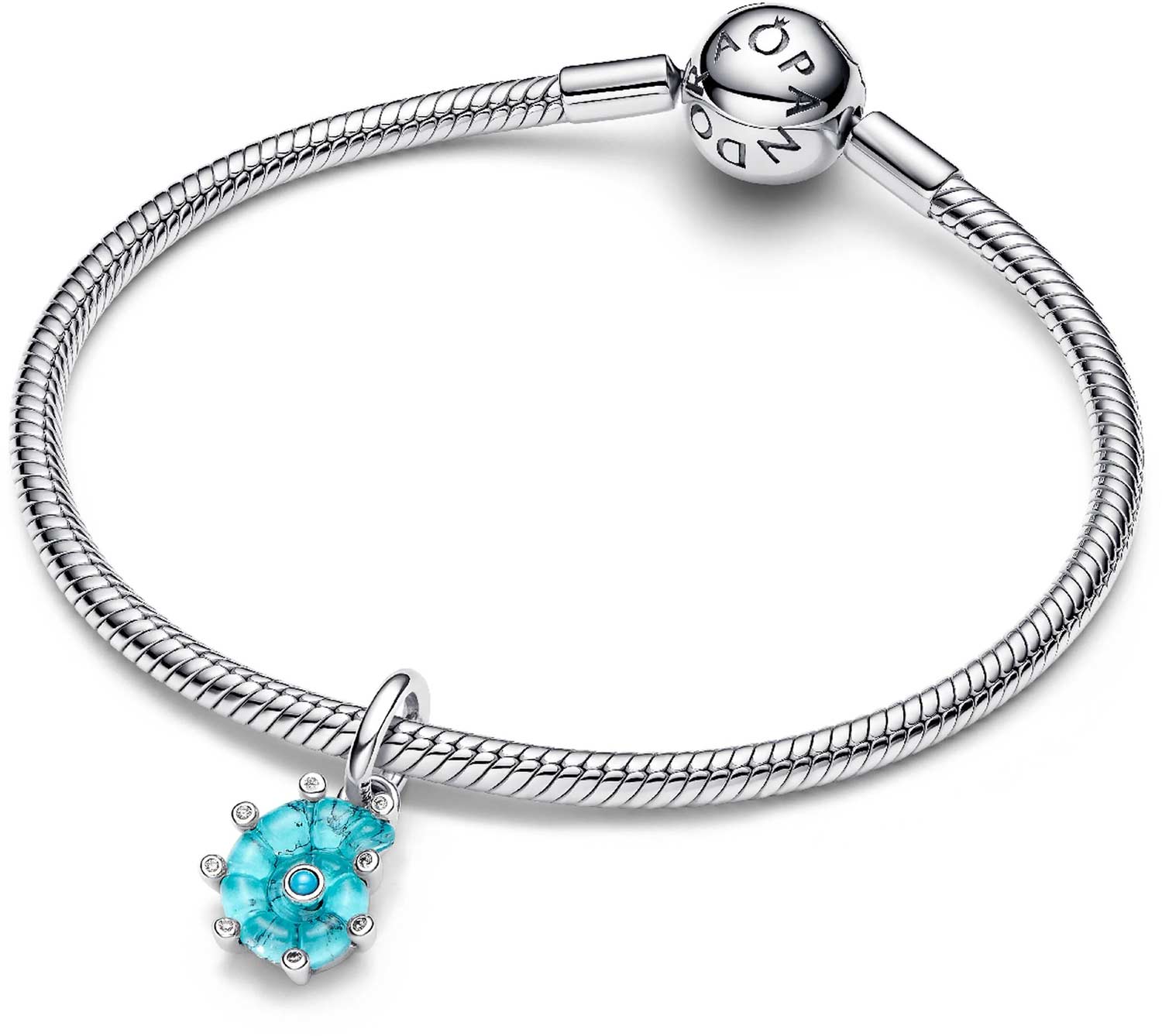 Фото «Серебряная подвеска-шарм ''Морская улитка'' PANDORA Moments 793900C01 с искусственной бирюзой, муранским стеклом, фианитами»